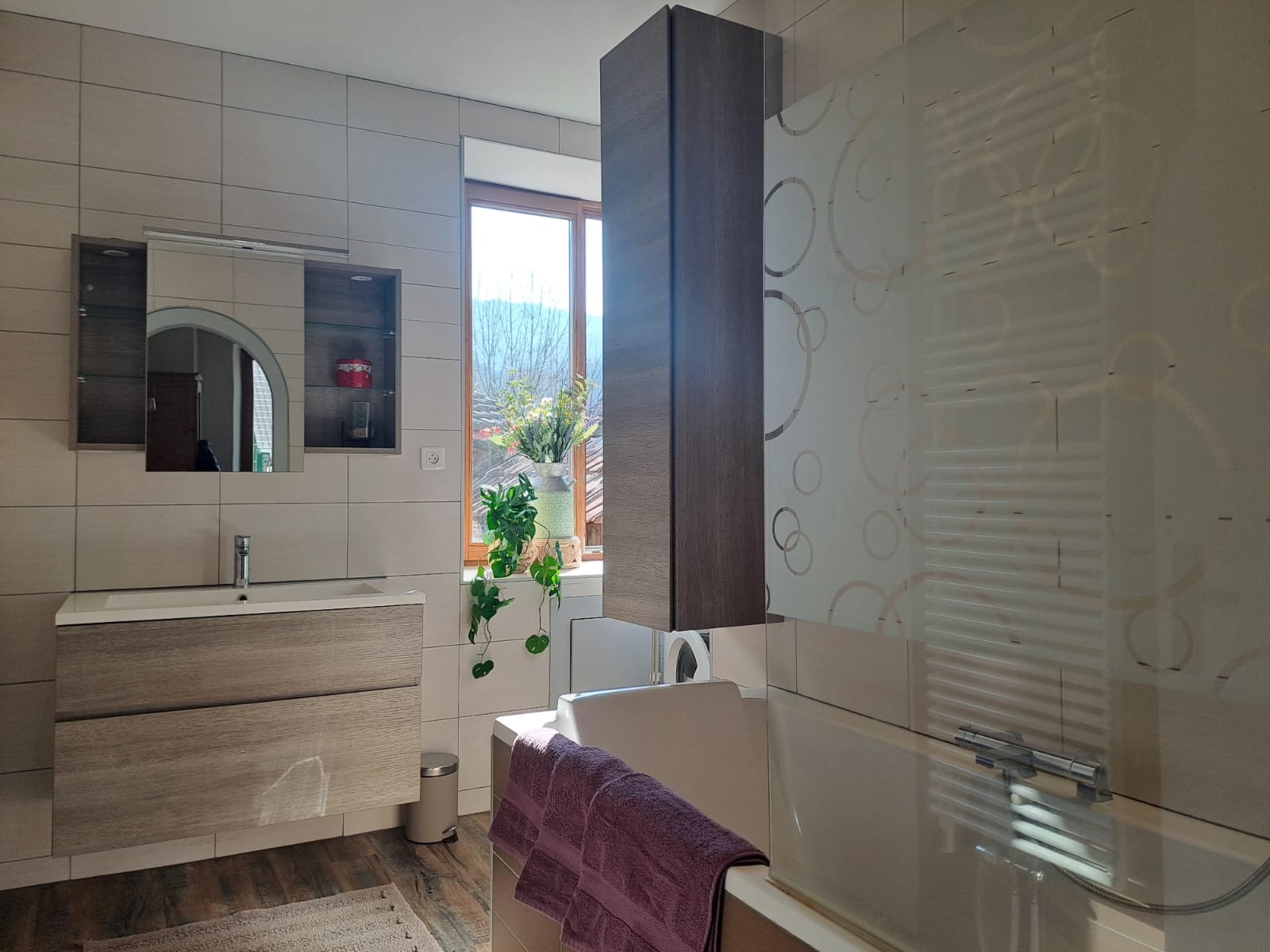 La grande entrée vous permet de déposer vos sacs et chaussures, de sécher vos manteaux en cas de pluie ou de neige en hiver, afin de profiter confortablement de l'appartement à l'étage.