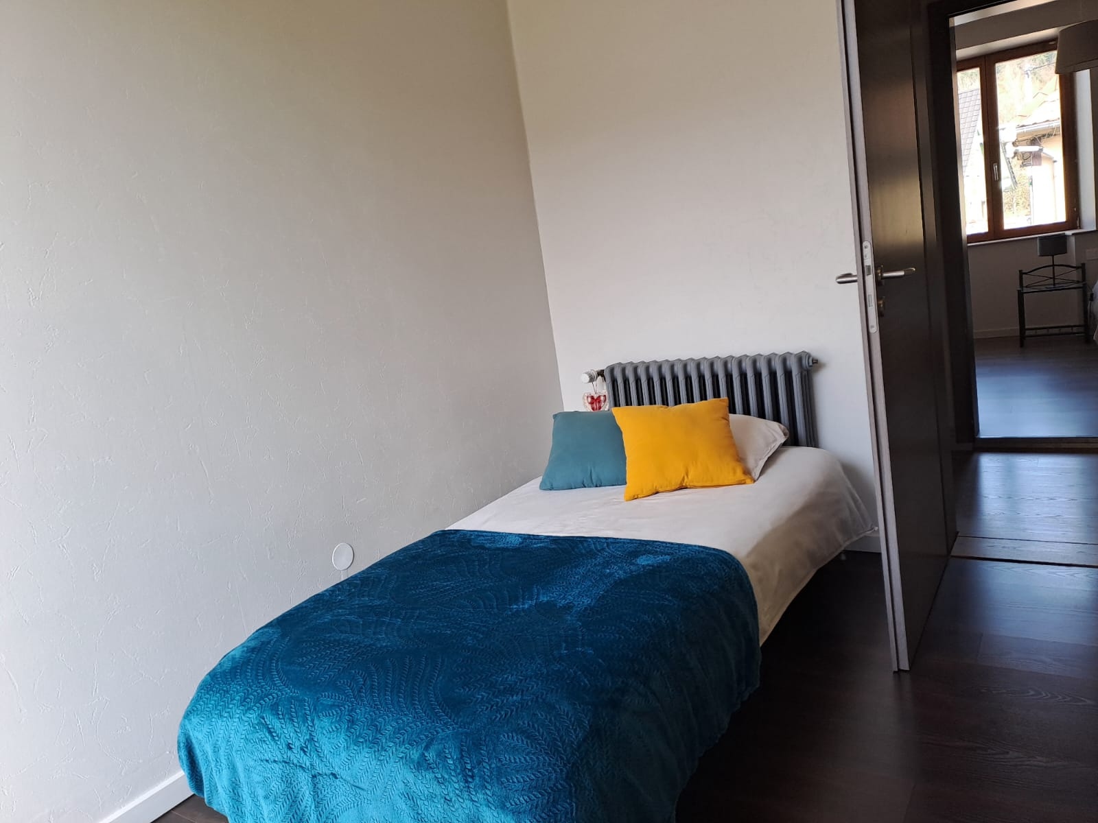Côté couloir, les 2 chambres, la salle de bain et les toilettes se situent en retrait de l'espace de vie, pour profiter du calme et de la quiétude de la maison!